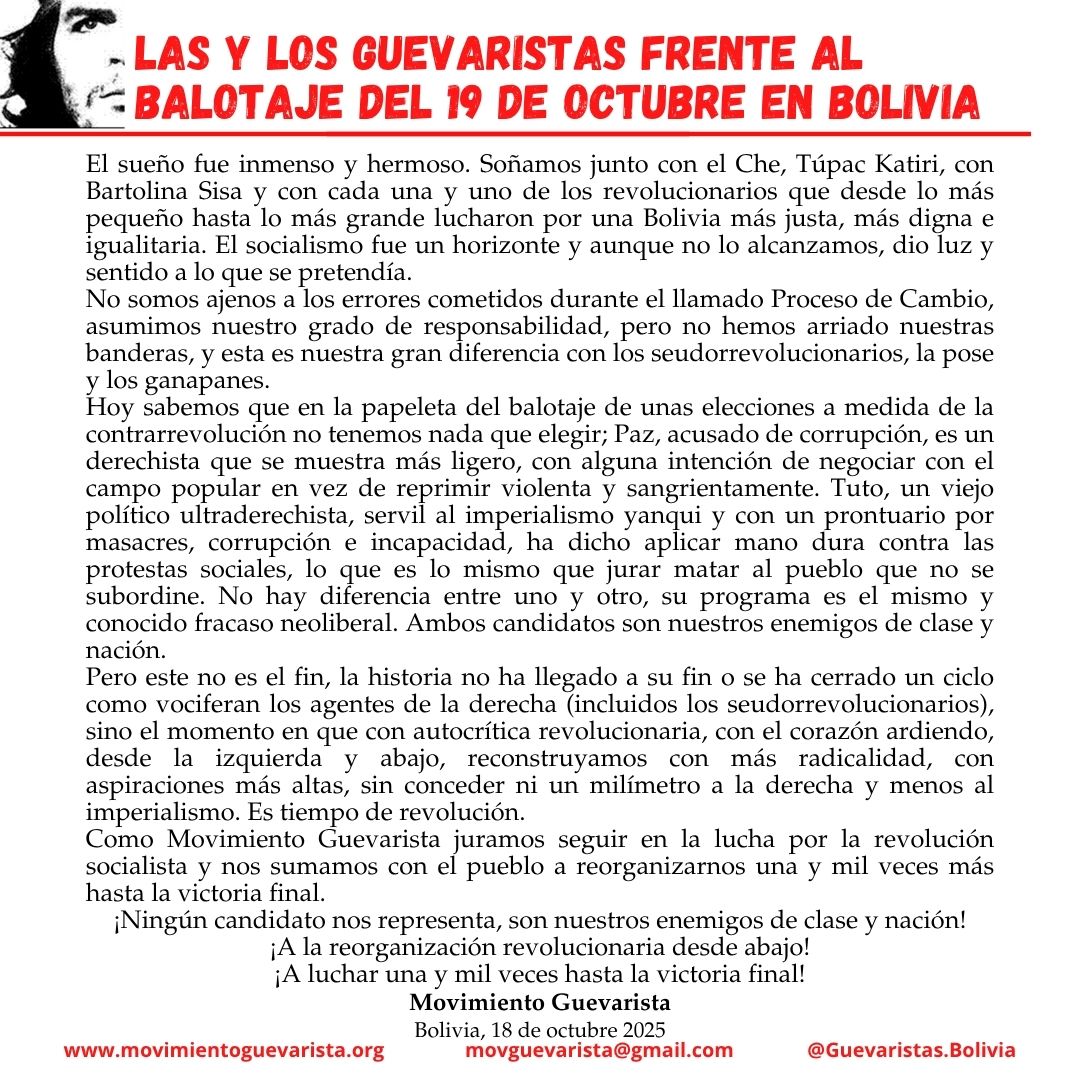 Hoy sabemos que en la papeleta del balotaje de unas elecciones a medida de la contrarrevolución no tenemos nada que elegir; Paz, acusado de corrupción, es un derechista que se muestra más ligero, con alguna intención de negociar con el campo popular en vez de reprimir violenta y sangrientamente. Tuto, un viejo político ultraderechista, servil al imperialismo yanqui y con un prontuario por masacres, corrupción e incapacidad, ha dicho aplicar mano dura contra las protestas sociales, lo que es lo mismo que jurar matar al pueblo que no se subordine. No hay diferencia entre uno y otro, su programa es el mismo y conocido fracaso neoliberal. Ambos candidatos son nuestros enemigos de clase y nación.