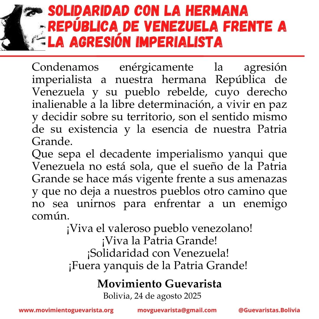 Condenamos enérgicamente la agresión imperialista a nuestra hermana República de Venezuela y su pueblo rebelde, cuyo derecho inalienable a la libre determinación, a vivir en paz y decidir sobre su territorio, son el sentido mismo de su existencia y la esencia de nuestra Patria Grande.
