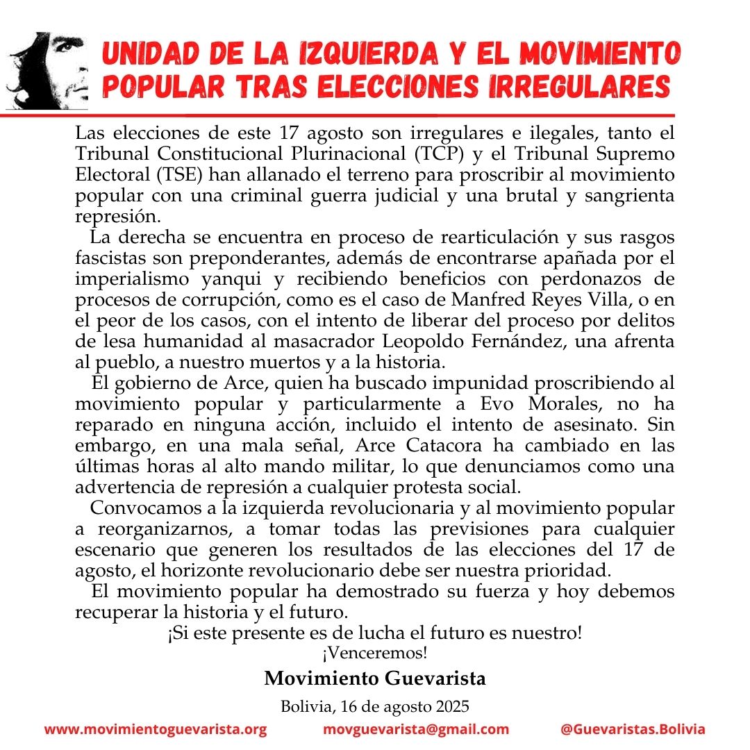 Convocamos a la izquierda revolucionaria y al movimiento popular a reorganizarnos, a tomar todas las previsiones para cualquier escenario que generen los resultados de las elecciones del 17 de agosto, el horizonte revolucionario debe ser nuestra prioridad.
